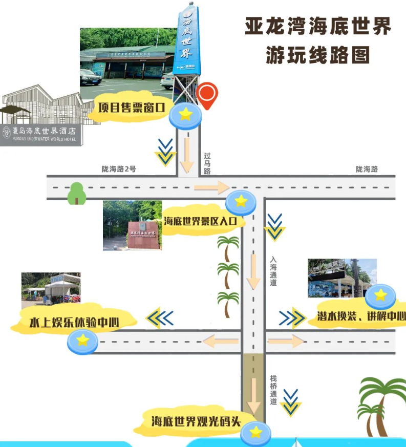 (2)公交:可乘坐27路、25路、24路、旅游专线15路公交车到达“亚龙湾海世界”站,往回走200米到达寰岛海底世界酒店,亚龙湾海底世界游客中心即在此处。